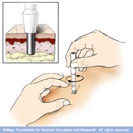 Place the punch perpendicular to the skin and apply firm and constant downward pressure with a circular twisting motion. Removal of the punch to "check the progress" should be avoided as this may result in a ragged wound and a shredded biopsy sample. A definite "give" occurs when the punch reaches the subcutaneous fat, indicating that a full-thickness cut has been made. Remove the punch and apply downward finger pressure at the sides of the wound to pop up the core. Completely elevate the core with gentle use of forceps or a needle tip and excise it at its base with small tissue scissors. The pressure applied through forceps to elevate the core should be gentle to minimize the destruction and distortion of tissue in the biopsy sample. After finishing the harvest of the tissue, prepare the biopsy site for closure。