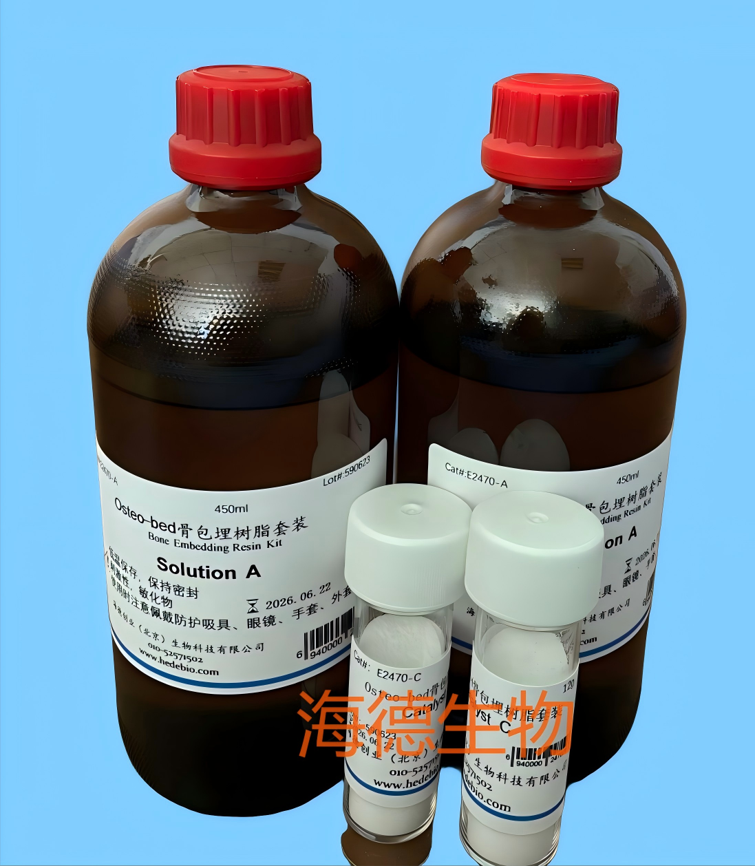 北京海德可提供兩種不同硬度的骨包埋樹脂套裝:貨號E2470和貨號E2480,均是主要以MMA樹脂為主體的聚合體系,用于未脫鈣組織的包埋切片!E2470套裝適用于骨髓活檢樣本、未脫鈣骨組織、軟組織的免疫組化研究。E2480套裝可以提供高硬度的樹脂包埋塊,更適于未脫鈣的骨組織、含有金屬種植體的骨組織、體內(nèi)支架等的包埋。