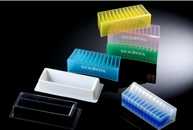 12道彩色試劑槽,每道的容積為5ml,并且每道都有印刷的數(shù)字標識,試劑槽反面同樣可以使用,可以容納50ml液體,材料為醫(yī)療級聚丙烯,不消毒,5種混合色:紅,藍,綠,黃和透明色,100個/箱。