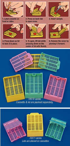 由乙?;酆衔镏谱鞫桑@種特殊的高密度聚合物,能使樣本安全的浸沒(méi)在溶液中。包埋盒對(duì)大多數(shù)組織溶劑有抗性,盒表面柵格能為液體交換提供最大流量、最適排水。蓋子或者附著在包埋盒上,或者獨(dú)立包裝。根據(jù)使用需求蓋子能夠隨時(shí)開(kāi)、合,隨時(shí)安全鎖定,不會(huì)損傷樣本。包埋盒三面均有較大的空白標(biāo)記區(qū)域,方便使用。