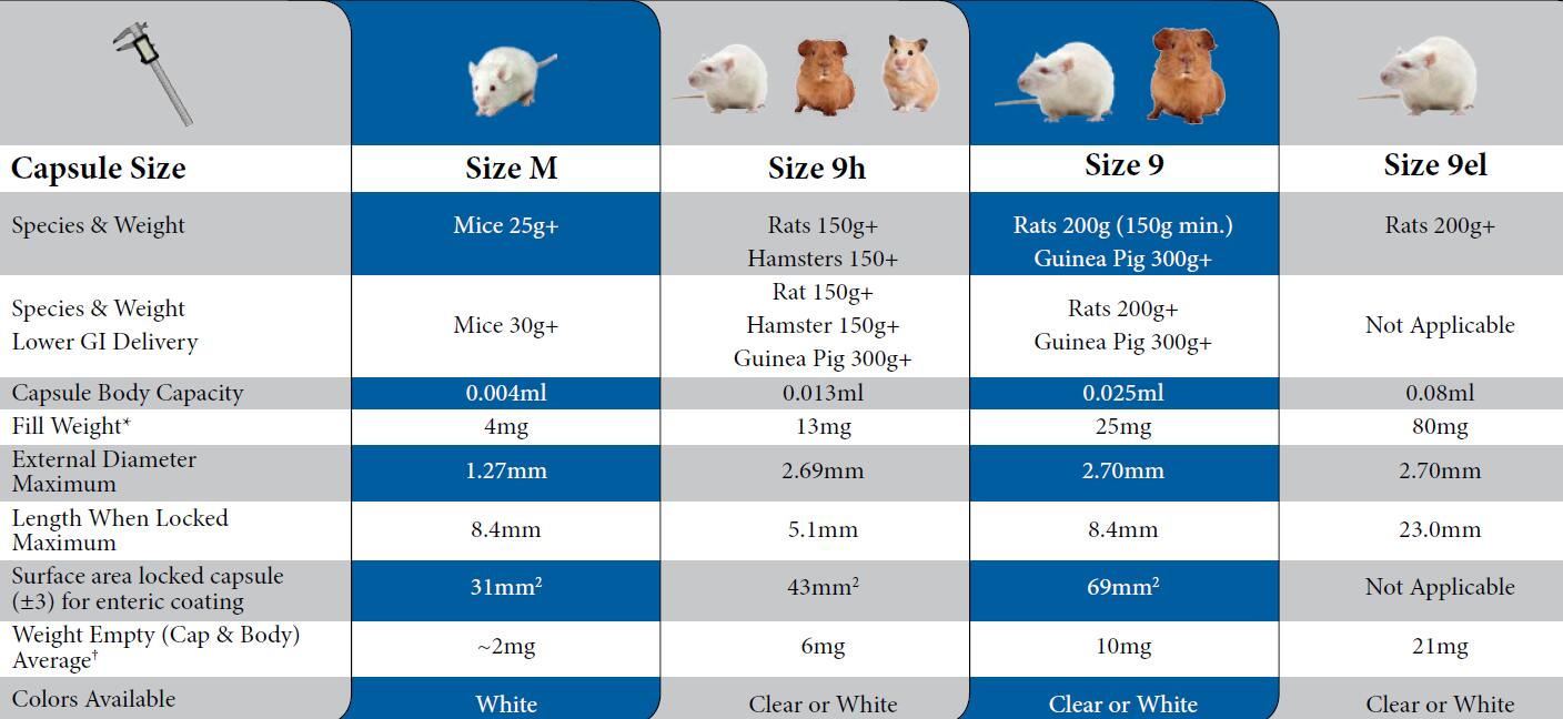 小動物專用膠囊根據(jù)使用對象的個體大小分為四個級別:9el號、9號、9H和M號。9號適用于大鼠(體重150g以上)和豚鼠;M號適用于體重大于30g的小鼠。另外,9號還適用于大鼠(200g-250g)的肛腸給藥(是不是也要考慮包衣問題?)??紤]到9el號膠囊太大,不適合腸溶,就不給出包衣的指導(dǎo)面積了。