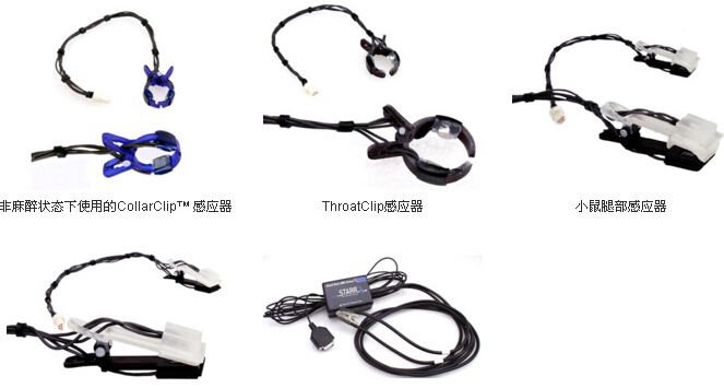 MouseOx Plus也即設(shè)備盒子,單獨(dú)這個(gè)設(shè)備并不能順利開(kāi)展工作,除去必備的電腦之外,傳感器(sensor clip)是必須選擇的配件。傳感器一般通過(guò)通用纜線(Universal Cable)與設(shè)備盒子連接??筛鶕?jù)實(shí)驗(yàn)對(duì)象來(lái)選擇夾持在動(dòng)物的不同體位的傳感器。
