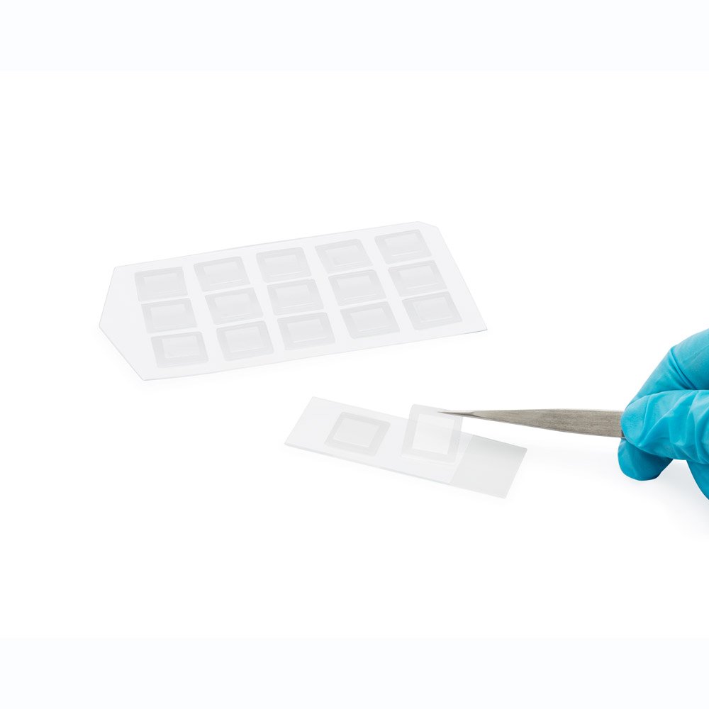 產(chǎn)品由上下兩部分構(gòu)成:上層是No.1.5厚度的玻璃蓋玻片,下層是0.5mm厚度的透明硅膠片,無菌直接使用。設(shè)計上硅膠片較玻璃片略大,比如蓋玻片12*12mm大小,下方的硅膠片17*17mm大小,產(chǎn)品大小特別適于培養(yǎng)皿和培養(yǎng)板使用。包裝時,背襯底板是透明大塑料板,一板15個,一包有5板(共計75個)。