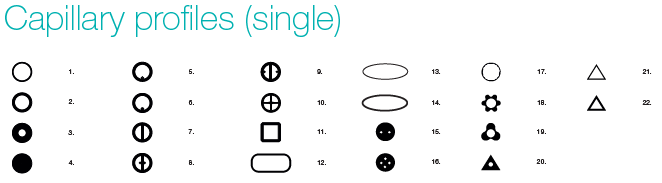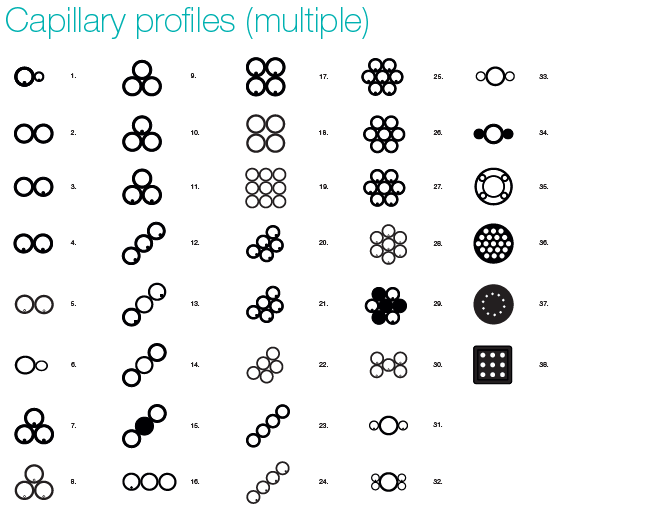原產(chǎn)德國(guó)的多孔道毛細(xì)管,分為兩大類(lèi)別,單管多孔道(single)和多管排列多孔道(multiple)。常見(jiàn)的圓形內(nèi)的多孔道排列,給出完美的幾何對(duì)稱(chēng),例如θ玻璃毛細(xì)管,這種對(duì)稱(chēng)是毛細(xì)管中層流的產(chǎn)生所必需的,同時(shí)也能限制流動(dòng)。