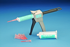 Sylgard 184硅橡膠(Kwik-Gard™Start Up kit)特別適合科學(xué)研究應(yīng)用??梢允∪セ旌蟽煞N膠帶來(lái)的麻煩和時(shí)間的浪費(fèi)。當(dāng)推進(jìn)注射器時(shí)自動(dòng)在尖部混合,無(wú)任何氣泡,直接用于位點(diǎn)。更換尖端就可以重復(fù)使用,有效避免了浪費(fèi)。每針筒含有37ml的硅膠樹脂和固化劑,針筒頭(tip)的體積0.75ml。針筒內(nèi)的硅橡膠是Sylgard 184,液體組分組成的雙組分產(chǎn)品,包括硅膠組分與固化劑。硅膠組分與固化劑按10:1重量比完全混合,形成中等粘度混合液,混合液將固化成為具有韌性的透明彈性體,硅橡膠在25℃的溫度固化需要24h,無(wú)放熱現(xiàn)象,無(wú)需二次固化。